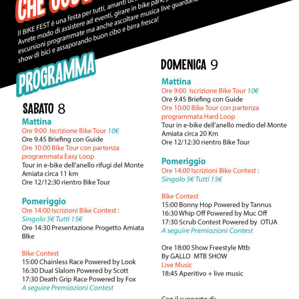 Ore 10:00 – Bike Tour in E-bike e bike Test by Scott & Amiata Freeride Bike School Ore 11:00 – Camminata Sensoriale e Yoga by Spazio Archè Ore 15:00 – Contest Kids con Bag Landing Ore 17:00 – Bike Show di Trial Mtb by Mattia Maccianti Ore 18:30 – Aperitivo e Dj Set by DJ Brando