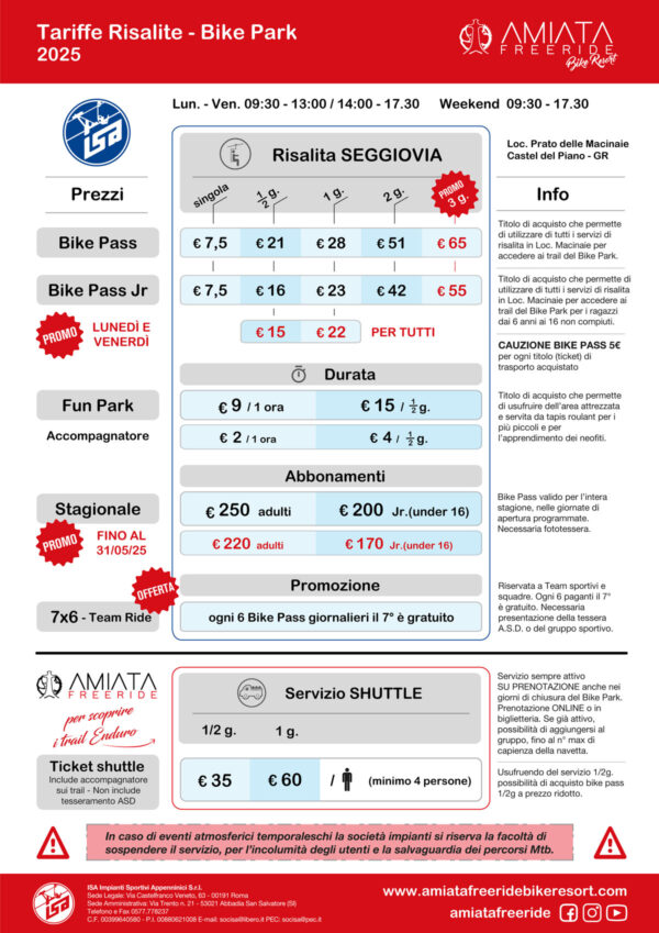 Vai al listino prezzi e tariffe per il noleggio di bike & attrezzature (protezioni, casco, ecc…).
